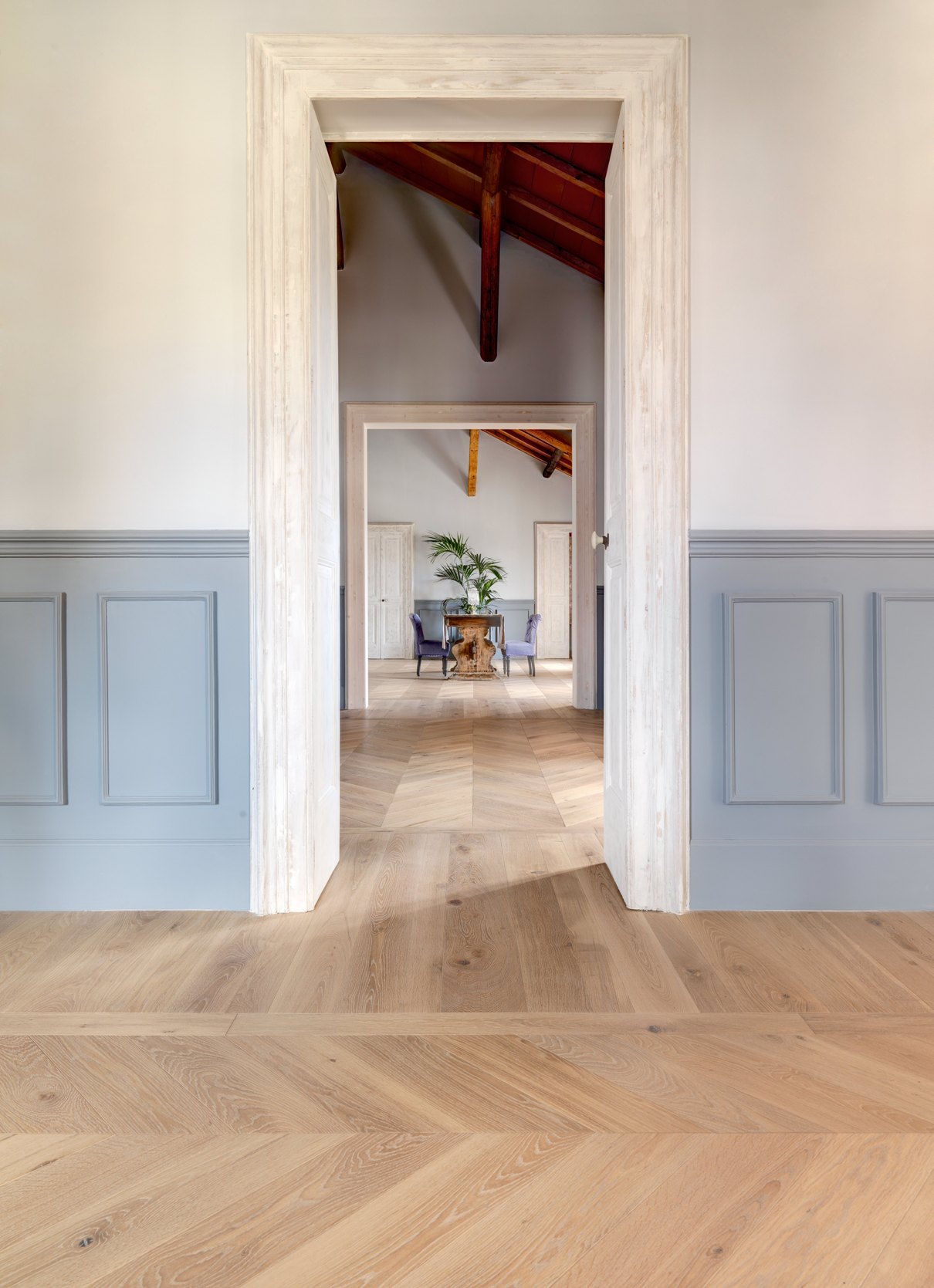 The Oak Sabbia parquet retains the charm of an ancient rural residence combined laid out in a Chevron pattern, which makes this wooden floor also suitable for a contemporary style.