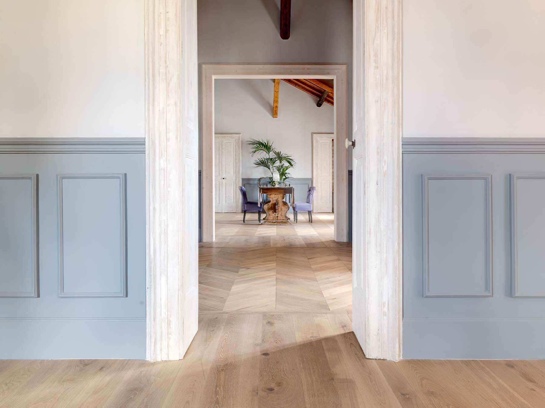 The Oak Sabbia parquet retains the charm of an ancient rural residence combined laid out in a Chevron pattern, which makes this wooden floor also suitable for a contemporary style.